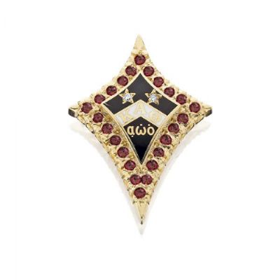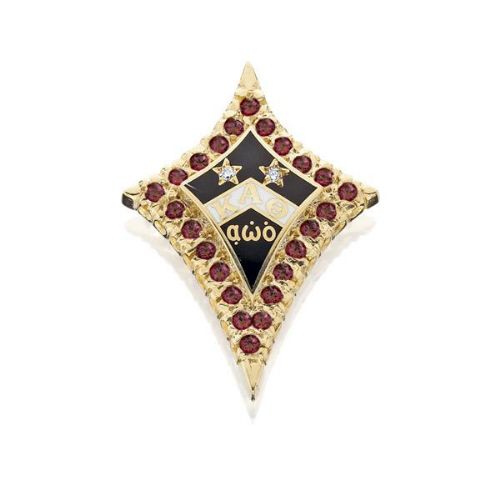 The official Kappa Alpha Theta badge with a synthetic stone border. Wear it with pride!