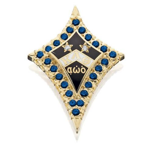The official Kappa Alpha Theta badge with a synthetic stone border. Wear it with pride!