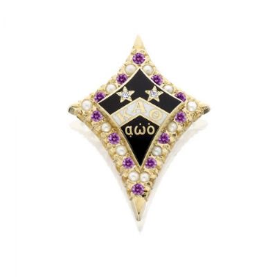 The official Kappa Alpha Theta badge with a pearl and synthetic stone border. Wear it with pride!
